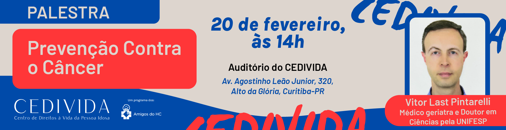 Somos o CEDIVIDA, o Centro de Direitos à Vida da Pessoa Idosa. Criado pela Associação dos Amigos do Hospital de Clínicas da Universidade Federal do Paraná, conhecida como os Amigos do HC. O nosso propósito é ressignificar o envelhecimento, promovendo protagonismo, longevidade, saúde e bem-estar, defesa de direitos, valorização do trabalho sênior, visibilidade e intergeracionalidade.